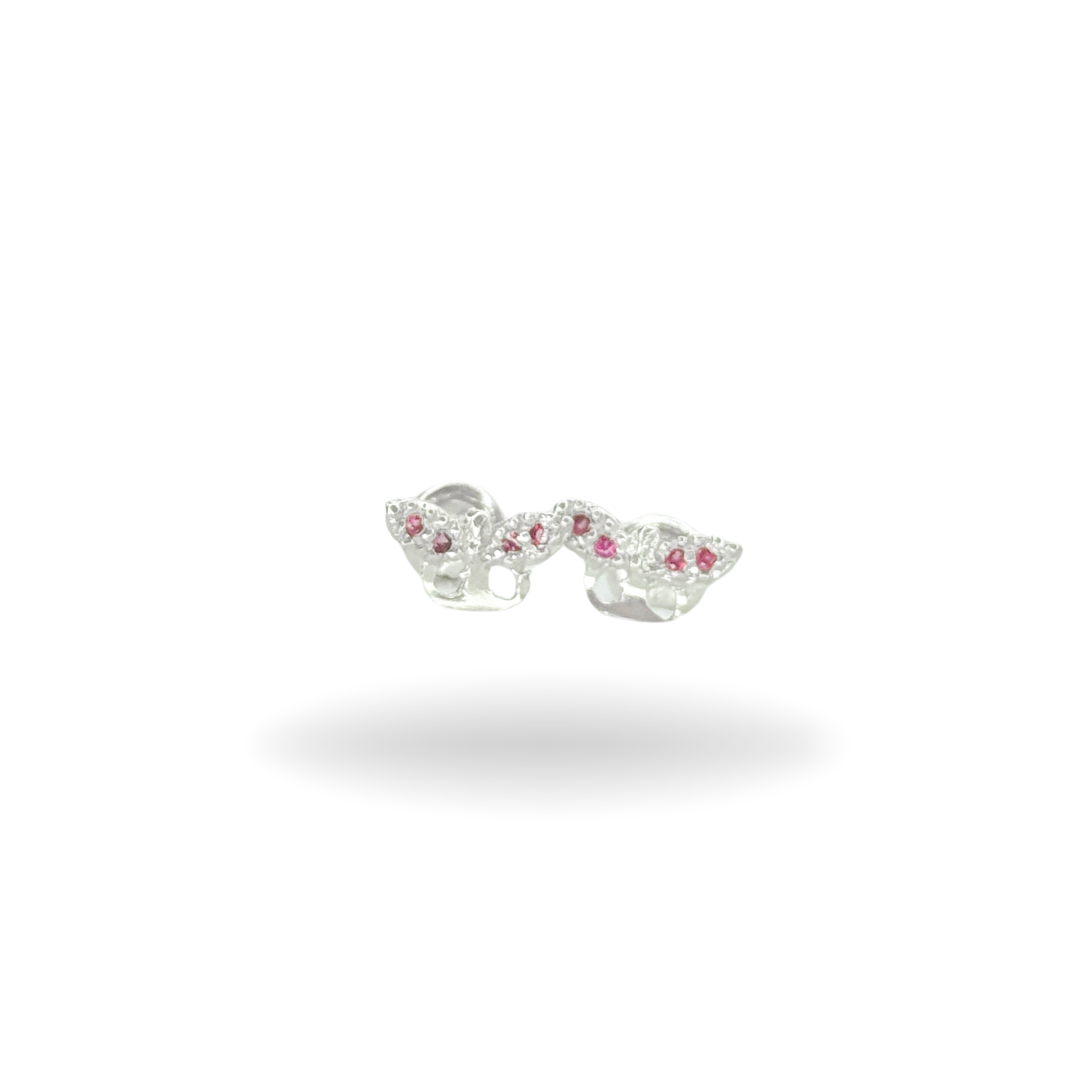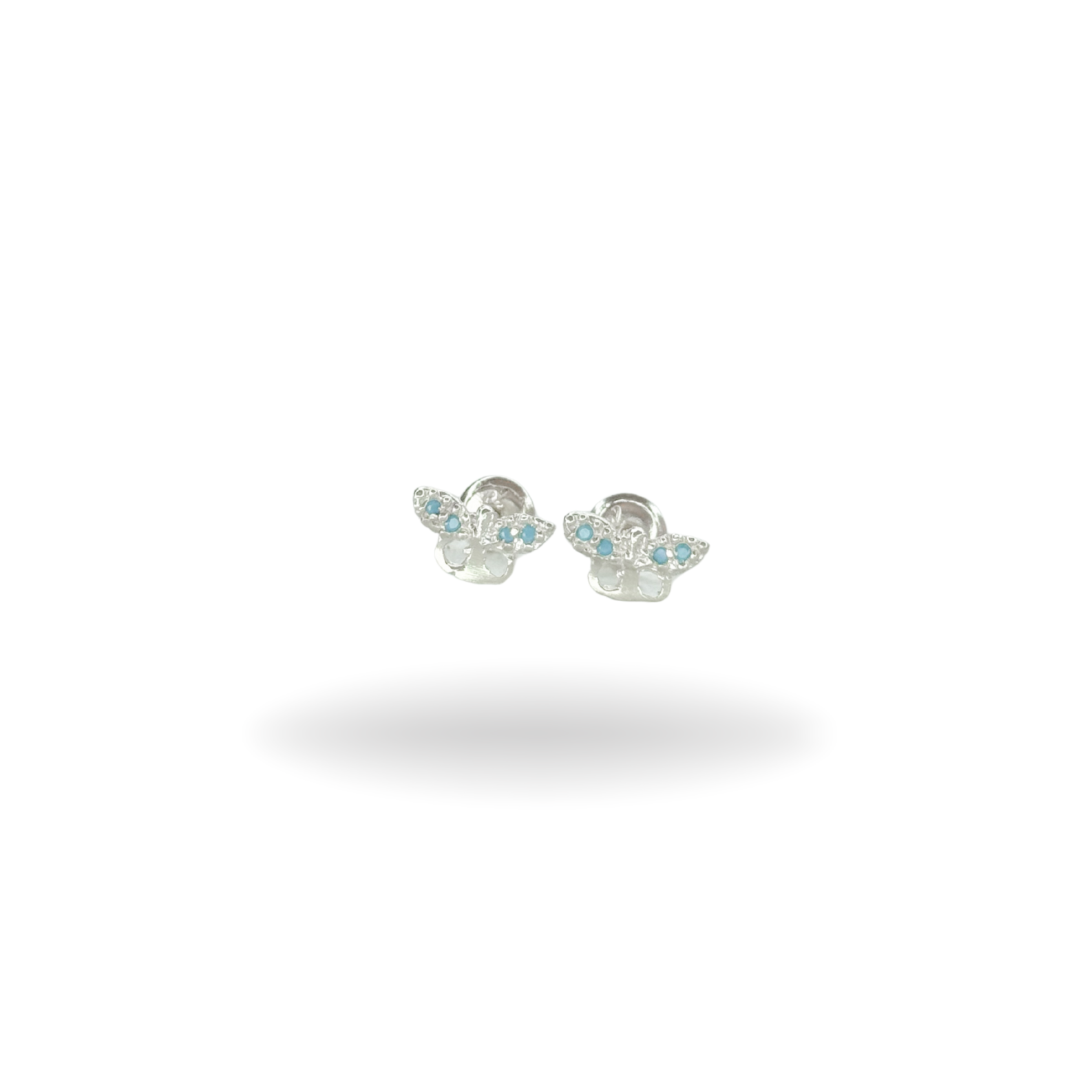 Aros pequeños mariposa, 0,3mm. Con incrustaciones de circonio rosada y celeste. Cuenta con tope protegido para la protección del bebé-niño