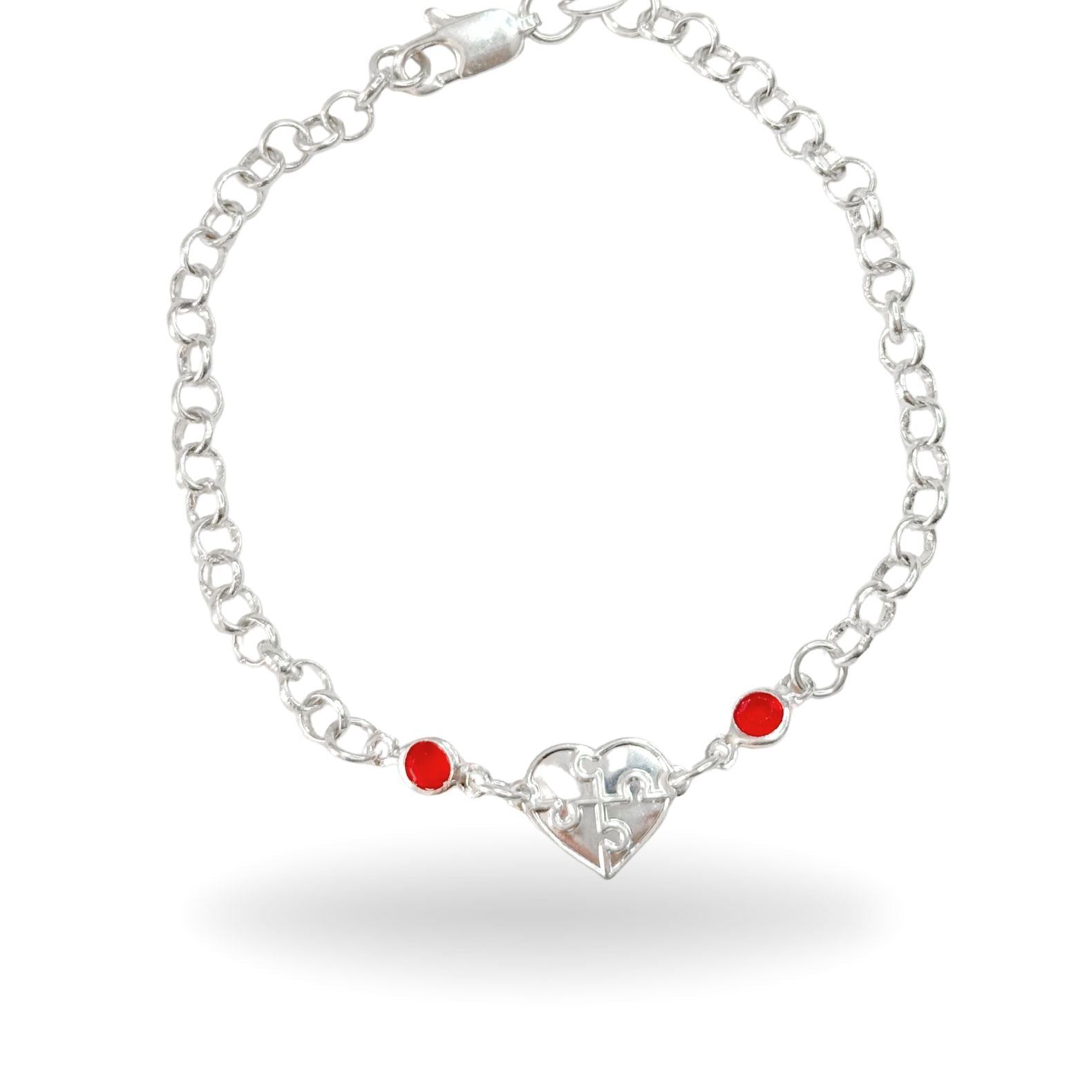 Pulsera de 18cm, con corazones de plata con diseño de puzle. Dos circones color rojo unidos por una fina cadena rolo delgada.
