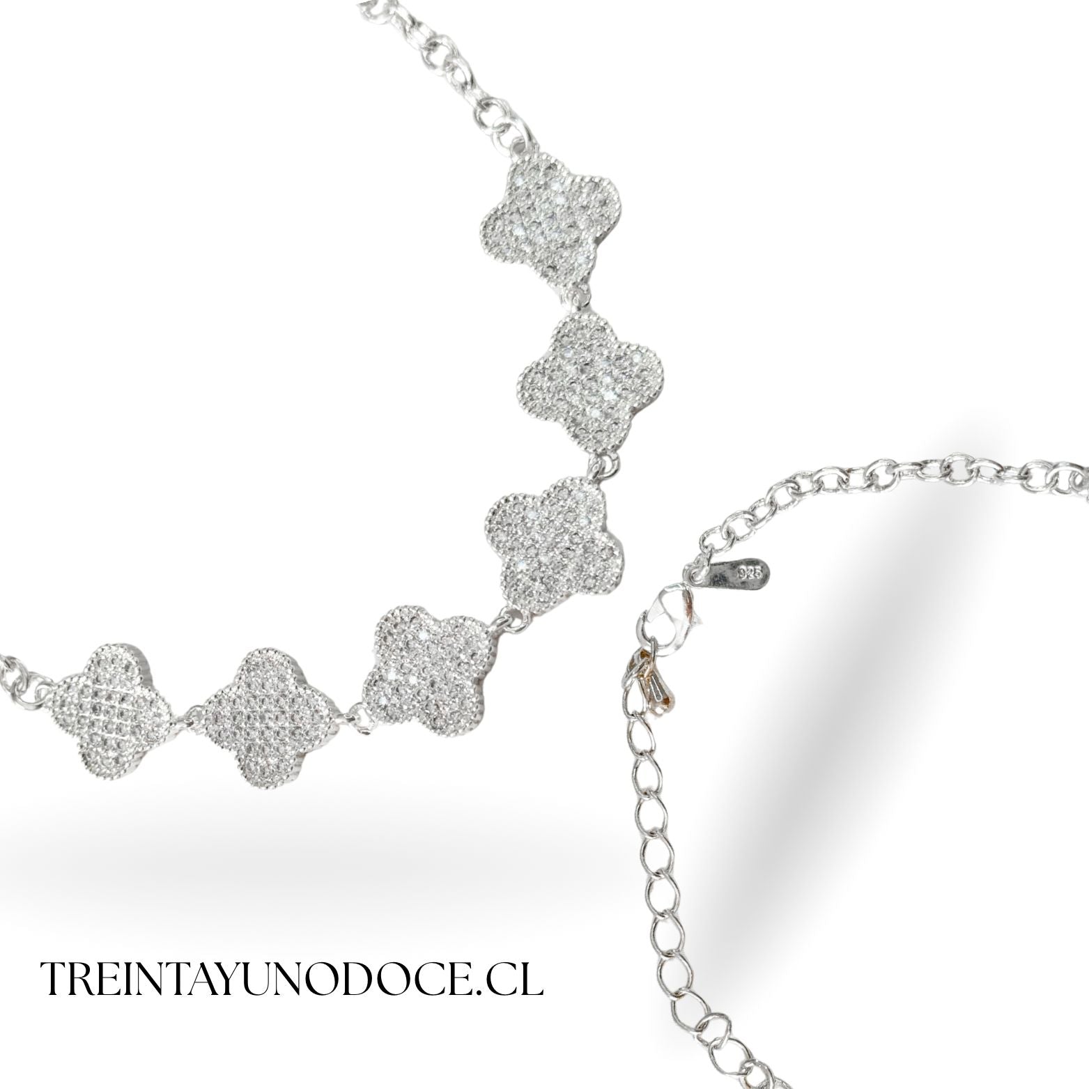Pulsera con seis treboles con incrustaciones de micro circon. Ajustable entre 18cm a 22cm de largo.